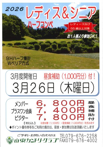 『3月度レディース&シニアハーフコンペ』 =ご予約受付中♡=
