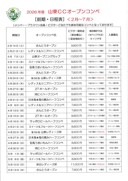 2026年度『山東CCオープンコンペ』=前期開催日程=