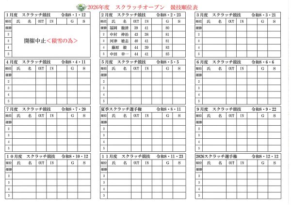 ※1月度スクラッチオープン競技は積雪の為、開催中止となりました