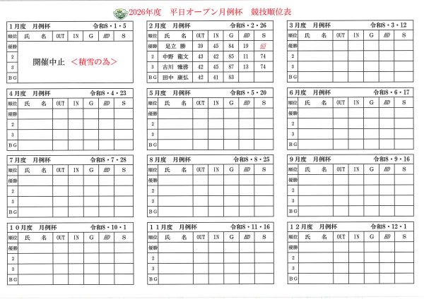 ※1月度平日オープン月例杯は積雪の為、開催中止となりました
